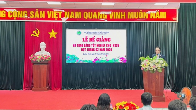 Photo: Mr. Le An, Vice Principal of the College of Mechanic, delivers remarks at the graduation ceremony.