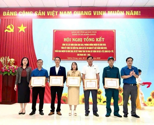 Ảnh: Lãnh đạo xã Nghĩa Giang trao Giấy khen cho đồng chí Lê An- Phó Bí thư đại diện Đảng ủy Trường Cao đẳng Cơ giới cùng đại diện 4 Đảng bộ khác đạt thành tích xuất sắc năm 2025.