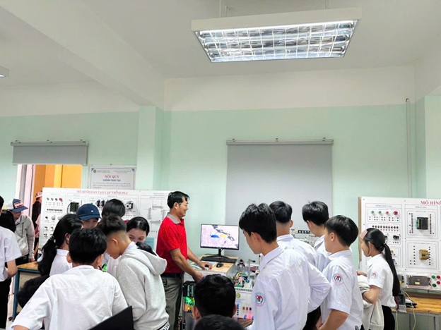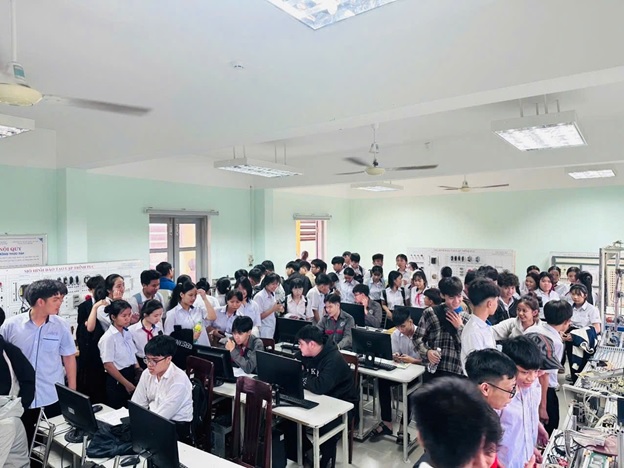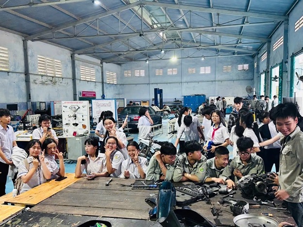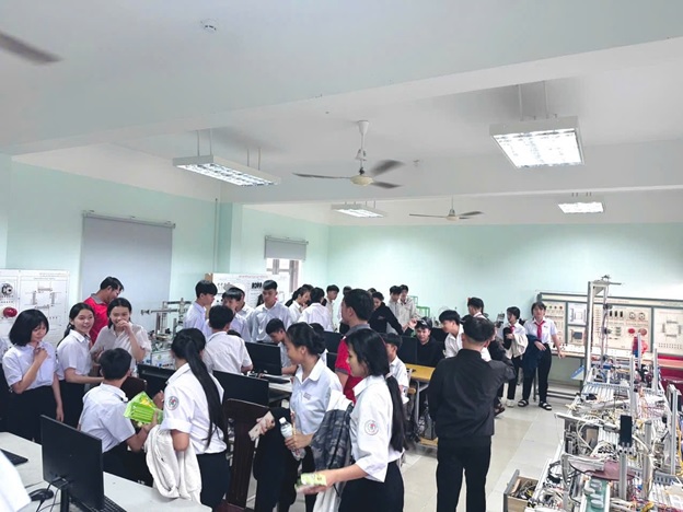 Điểm nhấn của chương trình là hoạt động tham quan thực tế, trải nghiệm sử dụng máy móc, thiết bị tại các xưởng thực hành các nghề như Điện, Công nghệ ô tô, Tin học văn phòng…; tham quan ký túc xá, sân bóng đá và các khu nhà chức năng của trường. Ngoài ra, các em học sinh còn được tham gia các trò chơi vui nhộn, bổ ích, giao lưu văn nghệ sôi nổi, giúp các em tự tin hơn trong giao tiếp. Trong khuôn khổ chương trình, nhiều em đã mạnh dạn đặt câu hỏi, trao đổi trực tiếp với giảng viên để hiểu rõ hơn về chương trình học và cơ hội nghề nghiệp tại trường.